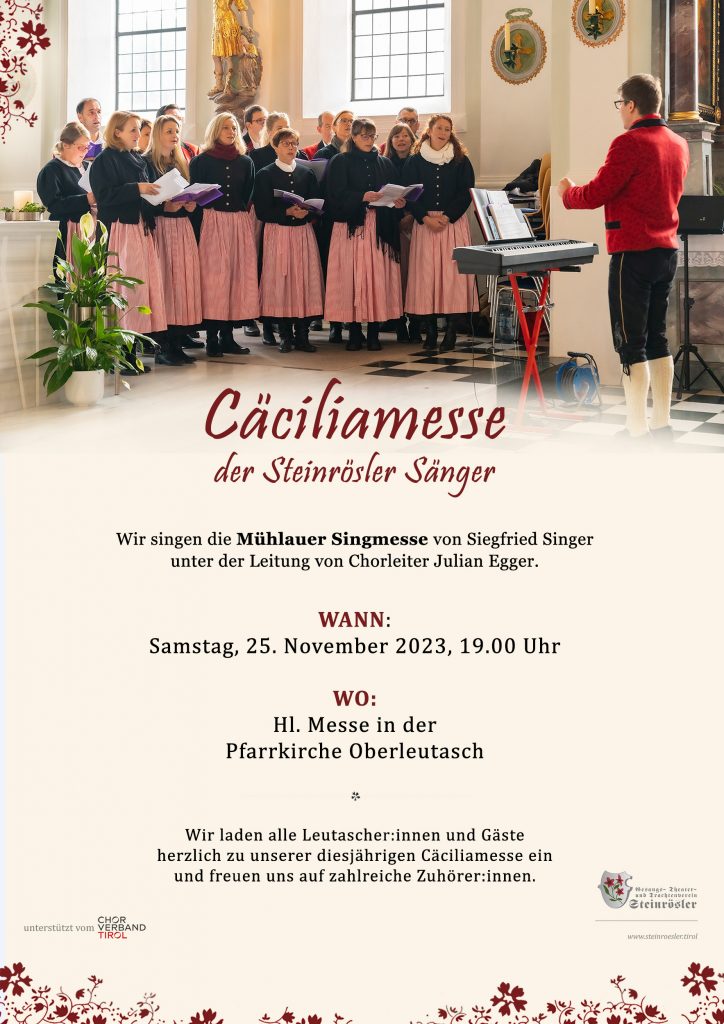 Am Samstag, den 23. November 2024, umrahmen wir um 19.00 Uhr zu Ehren der Hl. Cäcilia, Schutzpatronin der Kirchenmusik, den Festgottesdienst in der Pfarrkirche Oberleutasch. Ganz besonders freut uns, dass wir die Cäciliafeier heuer gemeinsam mit der Musikkapelle Leutasch gestalten werden. Wir freuen uns über zahlreiche Zuhörerinnen und Zuhörer.